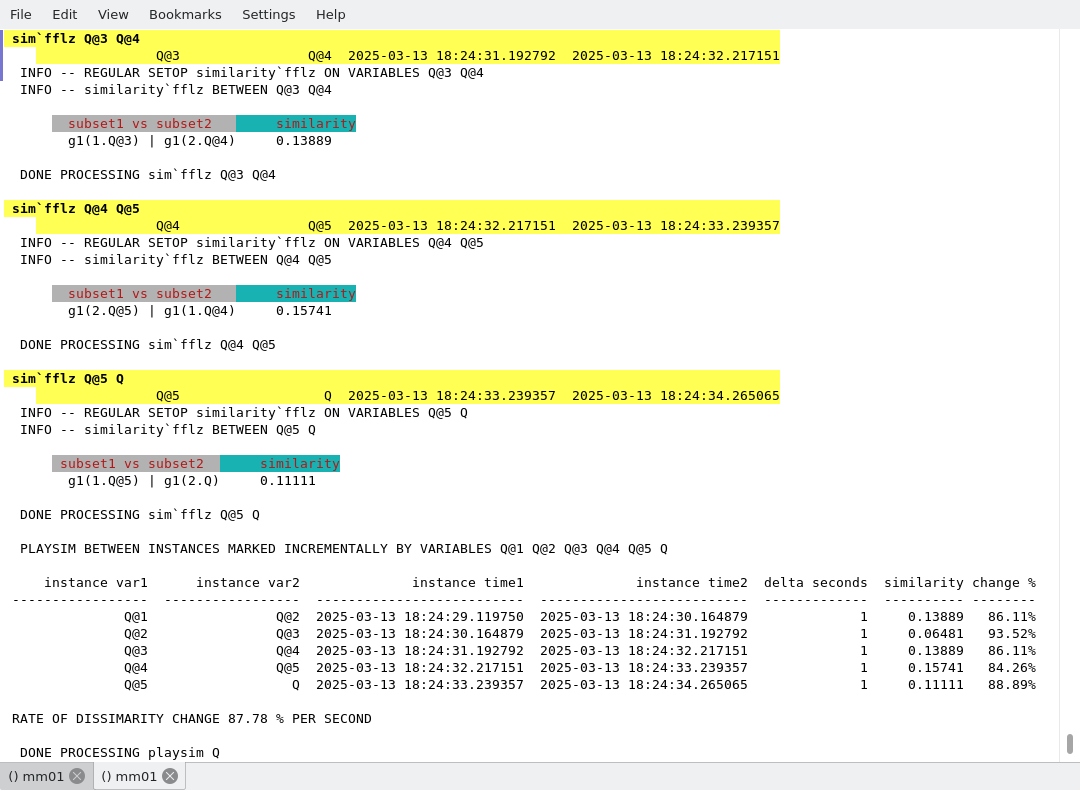 The command playsim displays the similarity between a set variable and all its archived historical. The rate of change in dissimilarity is shown once the command terminate execution.