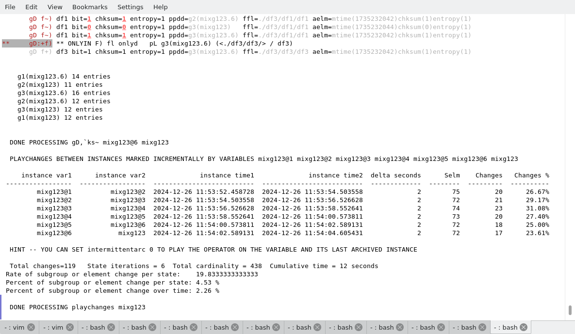 The following terminal shows the output when exercising with the playsim and playchanges in the sample workspace RANDONEBITMIX.