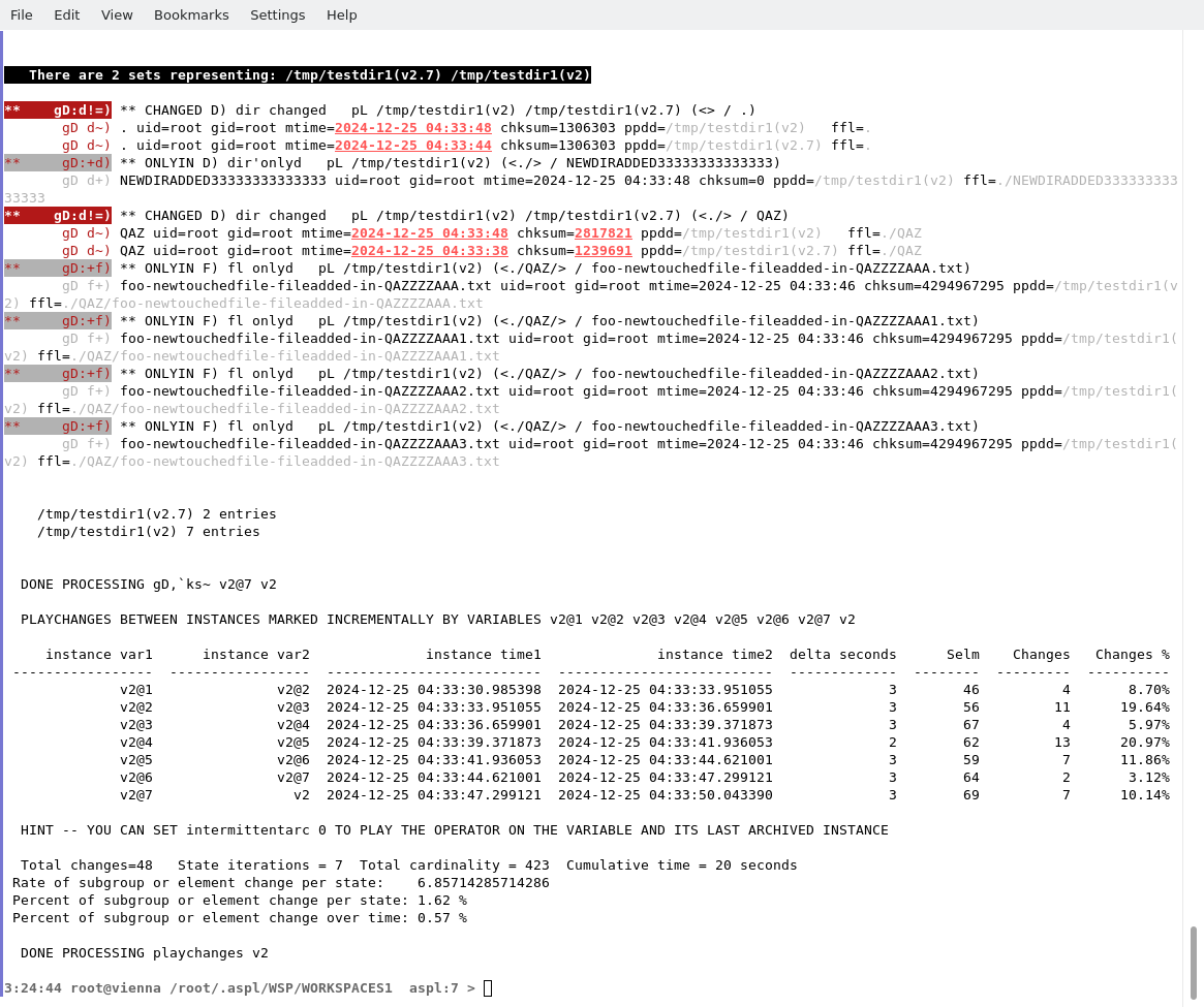 The following terminal shows the output when exercising with the playsim and playchanges in the sample workspace WS1DIFF3.