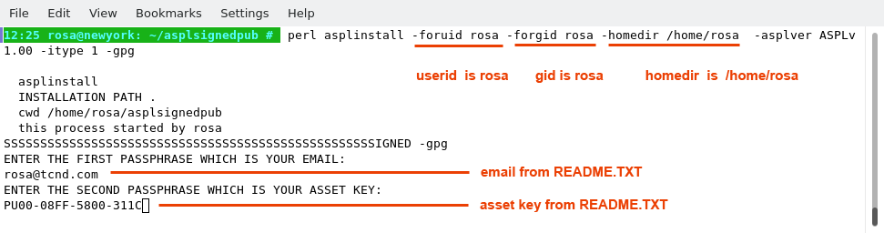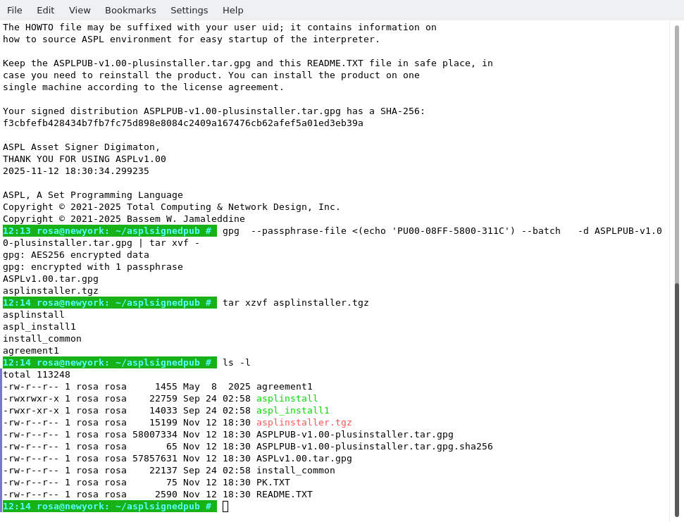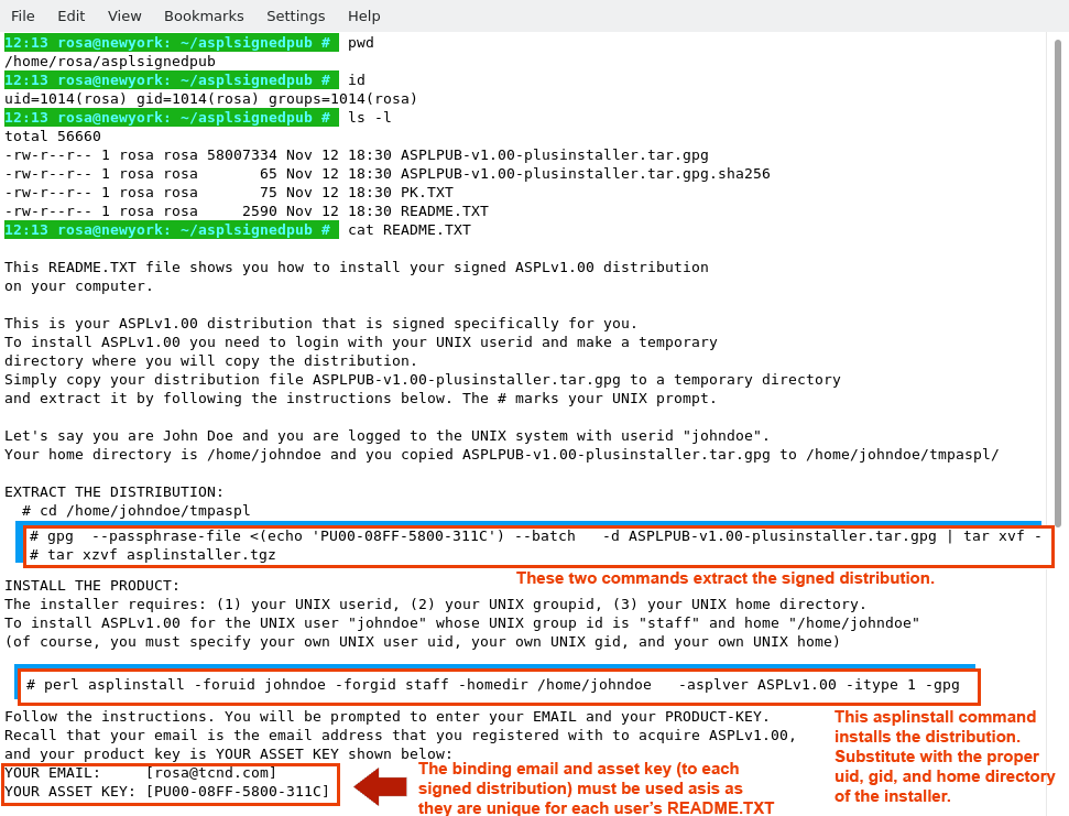 Copy the signed distribution file along the README.TXT to a directory. The following figure shows the user 'rosa' who copied the distribution into her UNIX home directory in ~/asplsignedpub. The contents of README.TXT is also shown. The README.TXT file contains three essential commands to fully install ASPL: the first two commands extract the product distribution, and the third install it.