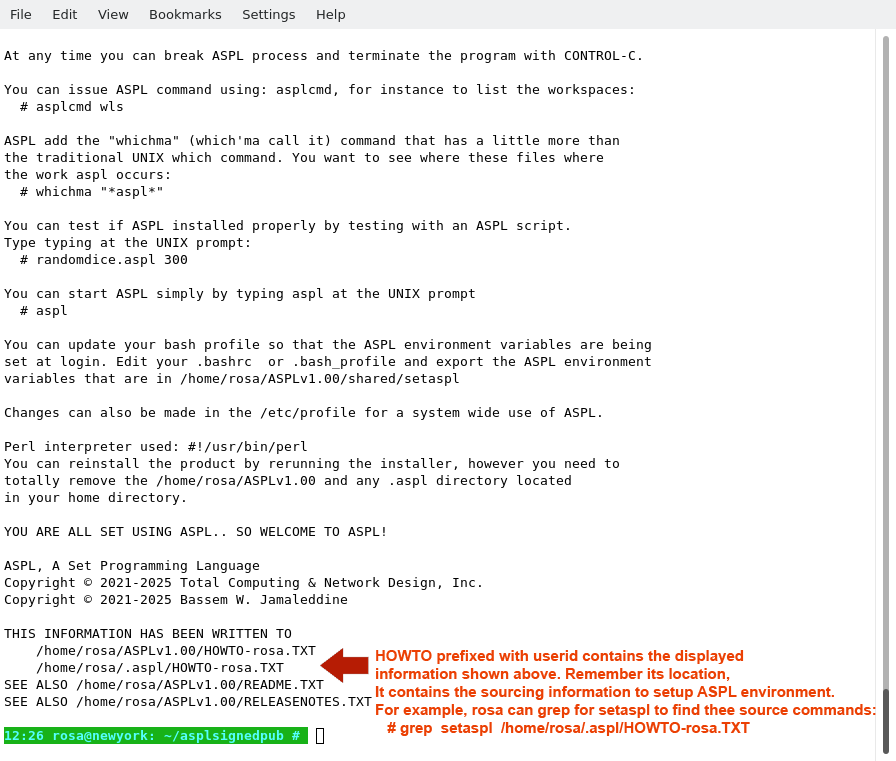 The following figure shows the final output of the installer after completing the installation. When you run the installer, pay special attention to the output written on the screen, where you will find valuable information on how to source ASPL environment, and test your installation. The same output is written to the file HOWTO suffixed with the user name, in this particular case it is in /home/rosa/.aspl/HOWTO-rosa.TXT.