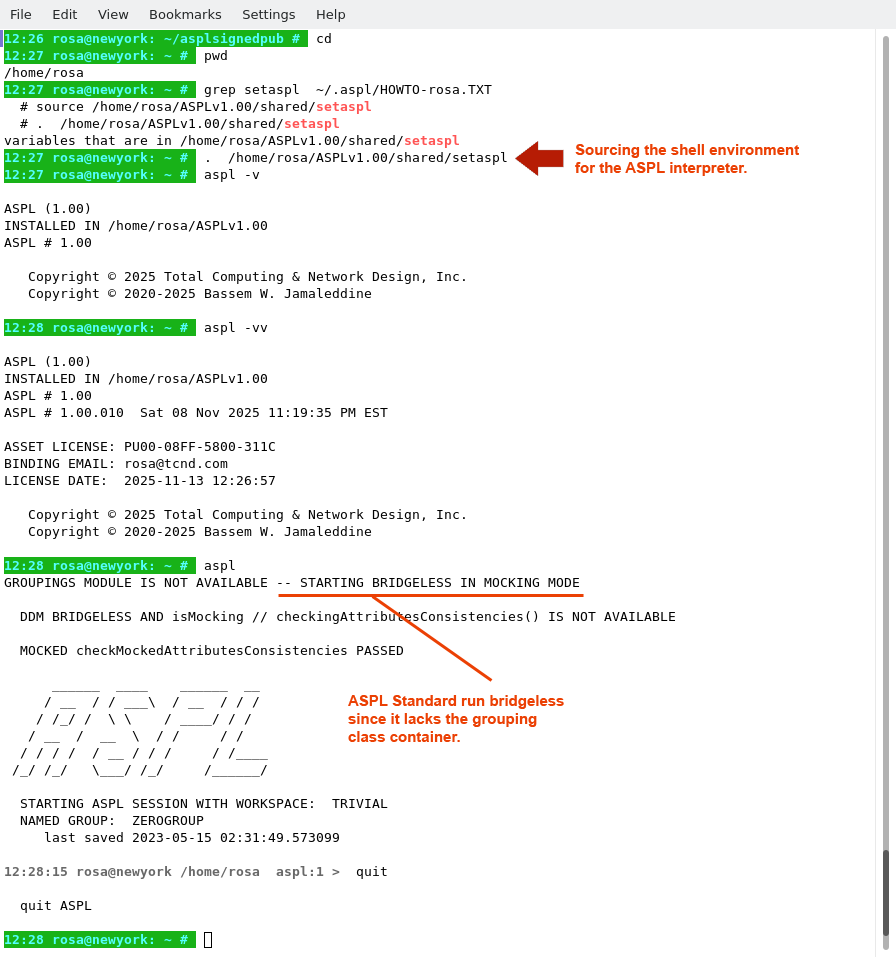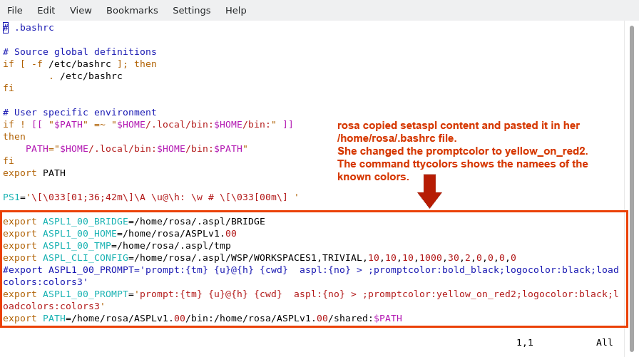 The following figure shows how rosa added the contents of /home/rosa/ASPLv1.00/shared/setaspl to her ~/.bashrc file.