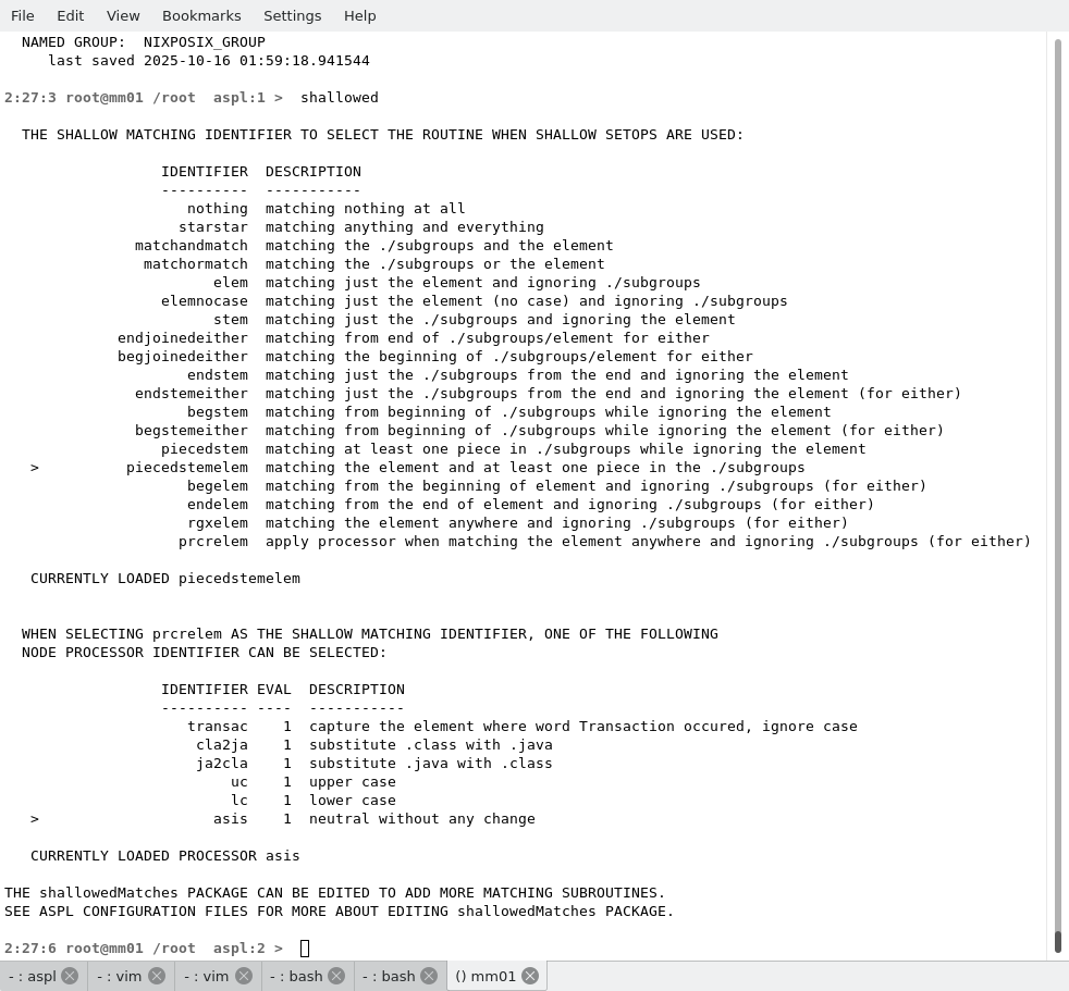 THE SHALLOW MATCHING IDENTIFIER TO SELECT THE ROUTINE WHEN SHALLOW SETOPS ARE USED: IDENTIFIER DESCRIPTION ---------- ----------- nothing matching nothing at all starstar matching anything and everything matchandmatch matching the ./subgroups and the element matchormatch matching the ./subgroups or the element elem matching just the element and ignoring ./subgroups elemnocase matching just the element (no case) and ignoring ./subgroups stem matching just the ./subgroups and ignoring the element endjoinedeither matching from end of ./subgroups/element for either begjoinedeither matching the beginning of ./subgroups/element for either endstem matching just the ./subgroups from the end and ignoring the element endstemeither matching just the ./subgroups from the end and ignoring the element (for either) begstem matching from beginning of ./subgroups while ignoring the element begstemeither matching from beginning of ./subgroups while ignoring the element (for either) piecedstem matching at least one piece in ./subgroups while ignoring the element > piecedstemelem matching the element and at least one piece in the ./subgroups begelem matching from the beginning of element and ignoring ./subgroups (for either) endelem matching from the end of element and ignoring ./subgroups (for either) rgxelem matching the element anywhere and ignoring ./subgroups (for either) prcrelem apply processor when matching the element anywhere and ignoring ./subgroups (for either) CURRENTLY LOADED piecedstemelem WHEN SELECTING prcrelem AS THE SHALLOW MATCHING IDENTIFIER, ONE OF THE FOLLOWING NODE PROCESSOR IDENTIFIER CAN BE SELECTED: IDENTIFIER EVAL DESCRIPTION ---------- ---- ----------- transac 1 capture the element where word Transaction occured, ignore case cla2ja 1 substitute .class with .java ja2cla 1 substitute .java with .class uc 1 upper case lc 1 lower case > asis 1 neutral without any change CURRENTLY LOADED PROCESSOR asis THE shallowedMatches PACKAGE CAN BE EDITED TO ADD MORE MATCHING SUBROUTINES. SEE ASPL CONFIGURATION FILES FOR MORE ABOUT EDITING shallowedMatches PACKAGE.