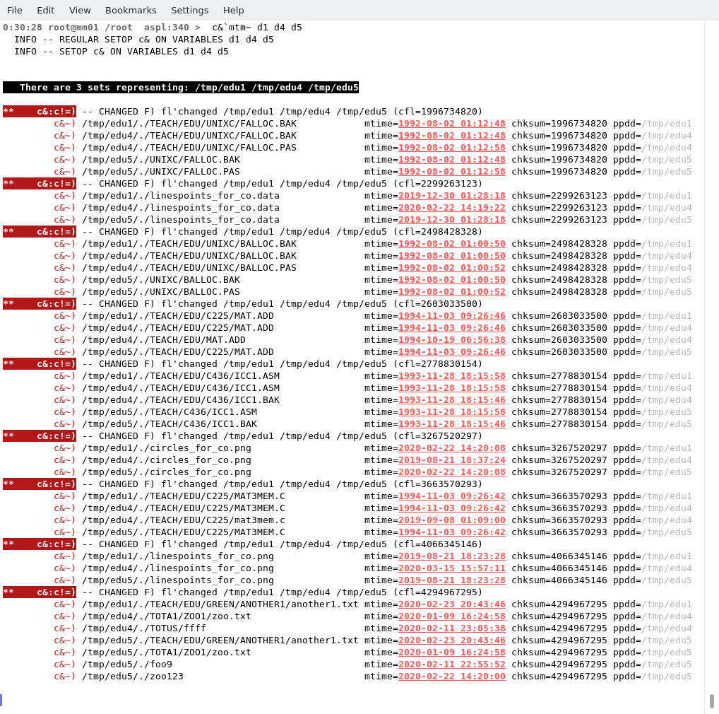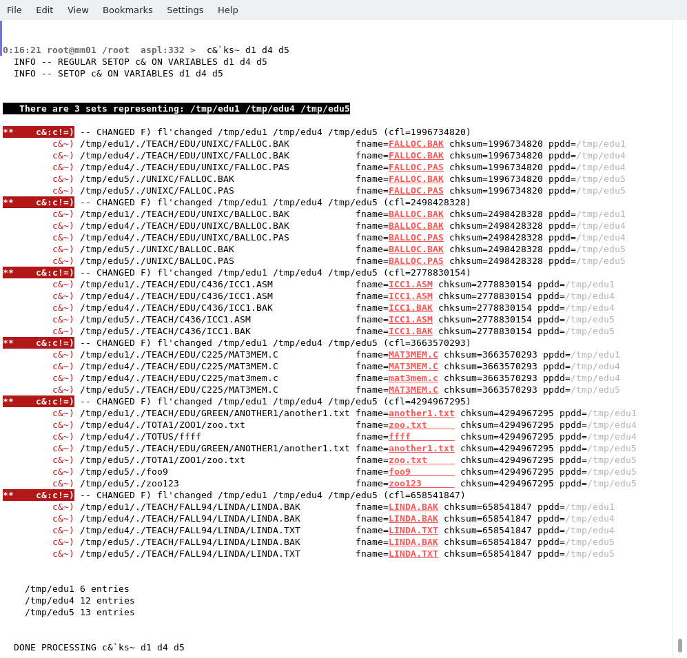 Finding Files with Different Names but with Identical ContentsIn this example, the three set variables d1, d4, and d5, represent the groups of files in three directories /tmp/edu1, /tmp/edu4, and /tmp/edu5 respectively. Use the c& to find the files that have a common checksum in a group of directories. Set ks vector to include the fname attribute, then tick c& with`ks~ to find these files in the three directories that have the similar contents, but have different names.
