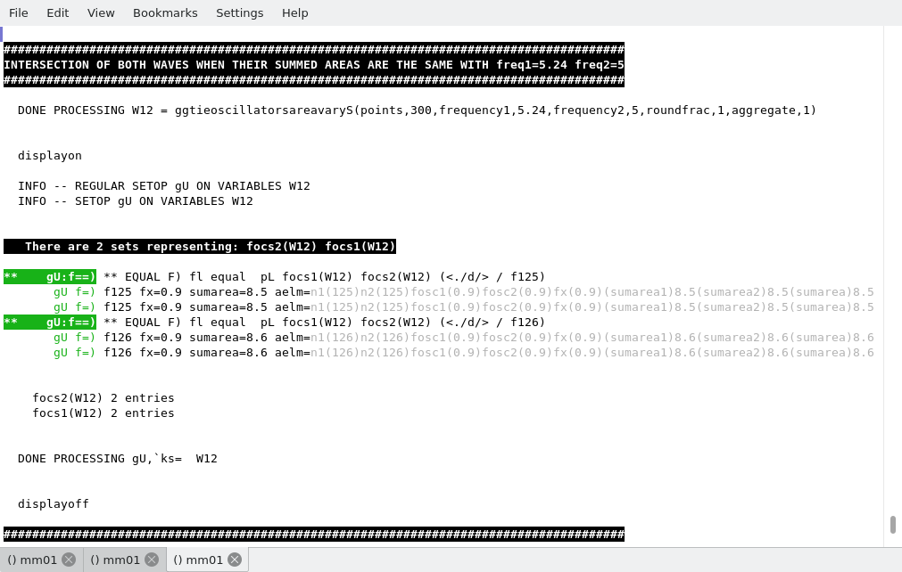Reassigning the W12 over time causes to turn the variable into a differential group variable: the waves are changing over time along the slight variation of the frequency of the first wave. Therefore we can use the ASPL playop on the group union of the differential group variable W12 to find where the beats occured. The following script, wavesbeat2.pl, is an alternative script to the one shown above. Here on line LL the playop ...