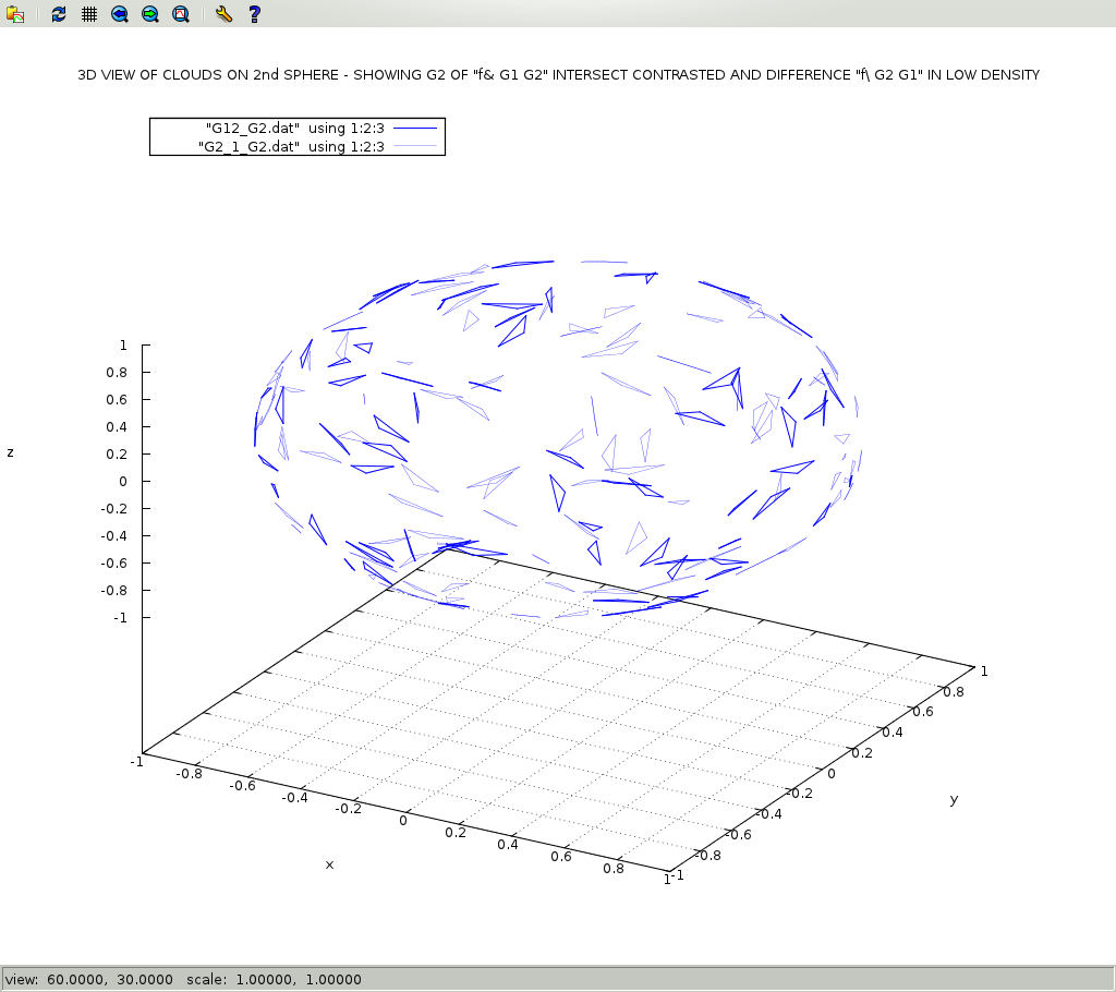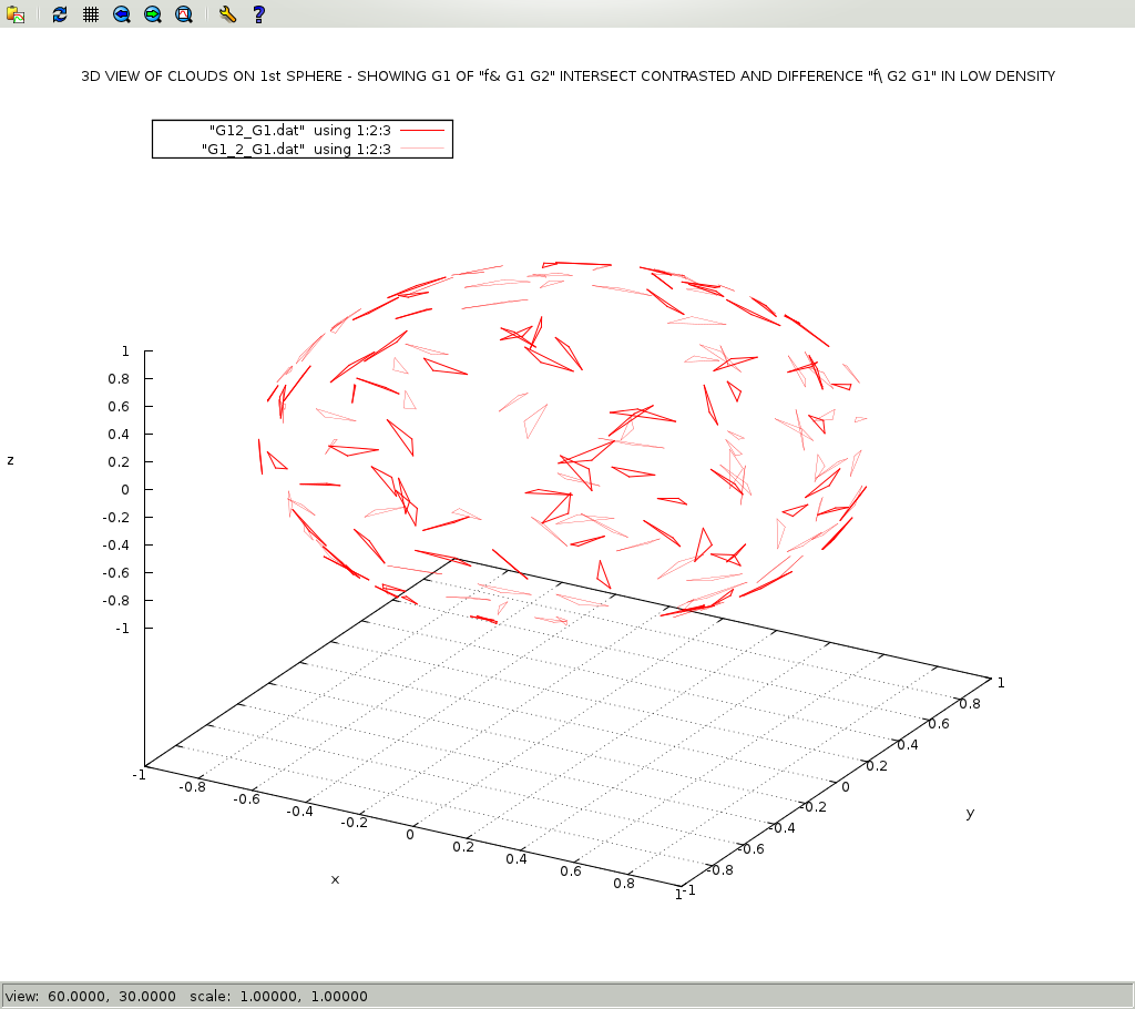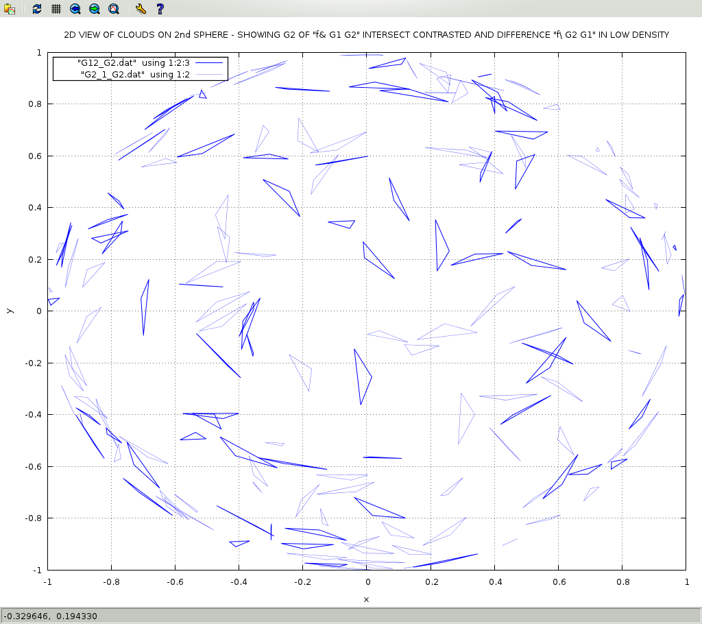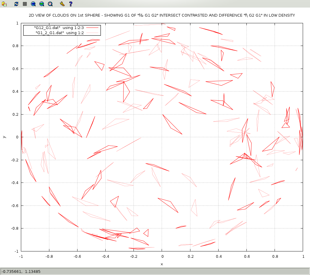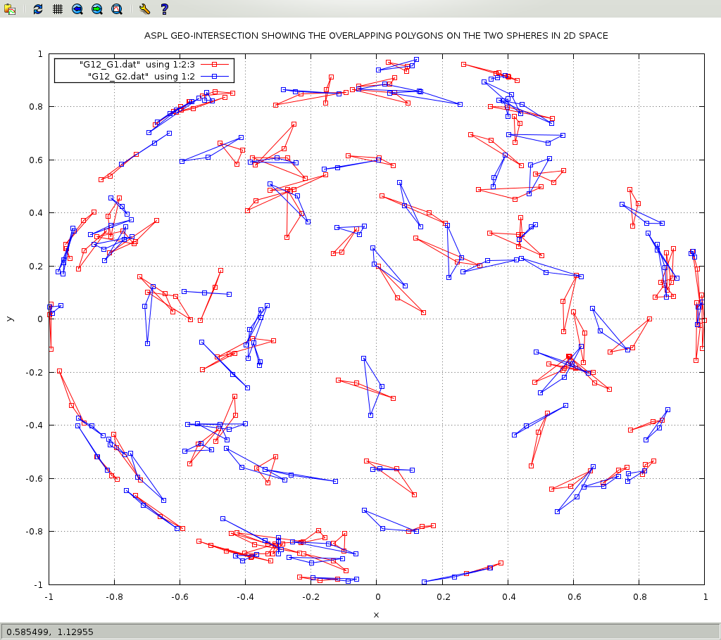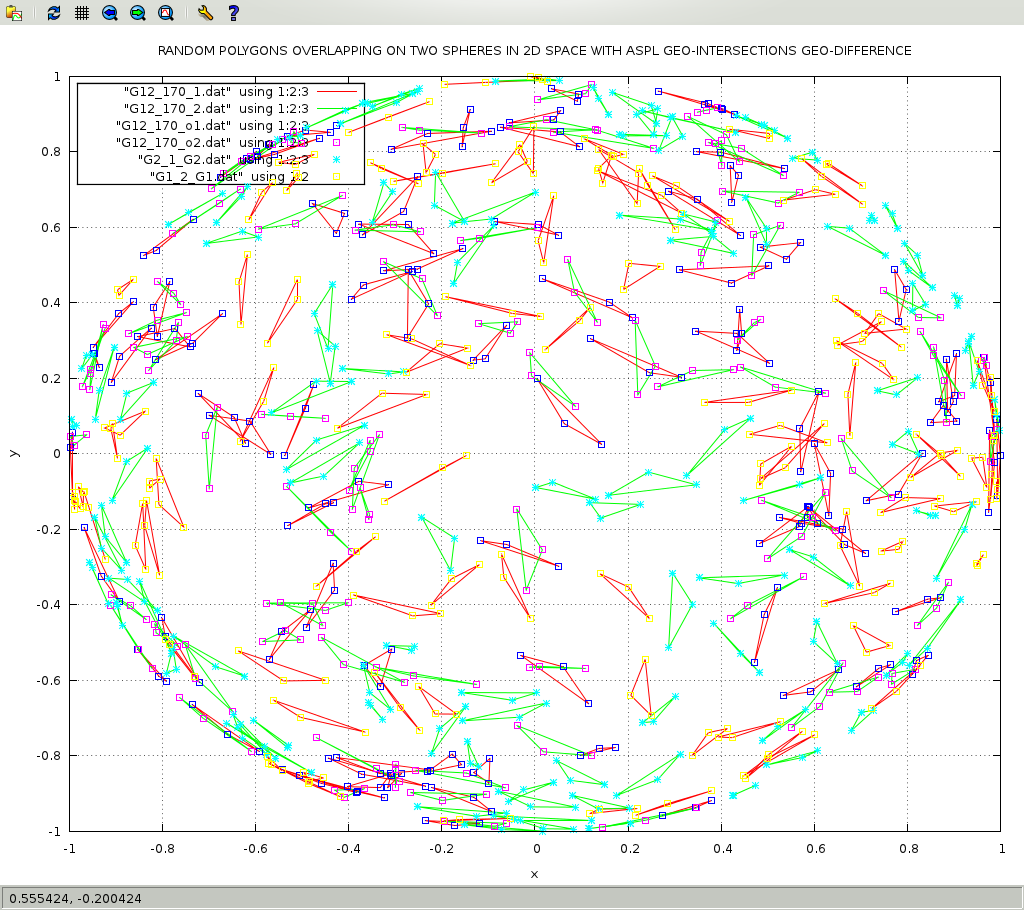 create the groups of random polygons by calling ggRPO2Sov() and assign it to set variable G12_170 split the resulting set variable G12_170 into two set variables G1 and G2: G1 contains the first sphere polygons, and G2 contains the second sphere polygons. call f& on G1 and G2 to get their intersects, and assign the result to G12. call f\ on G1 and G2 to get their difference, and assign the result to G1_2. call f\ on G2 and G1 to get their difference, and assign the result to G2_1. the merge operation shown below is not required with latest version of ASPL. The merge of a variable into itself will just add a GADg to the variable, but if it is not needed then spare the memory.