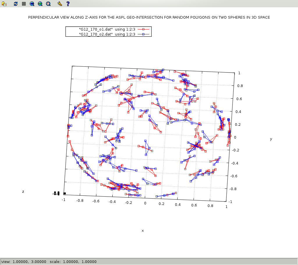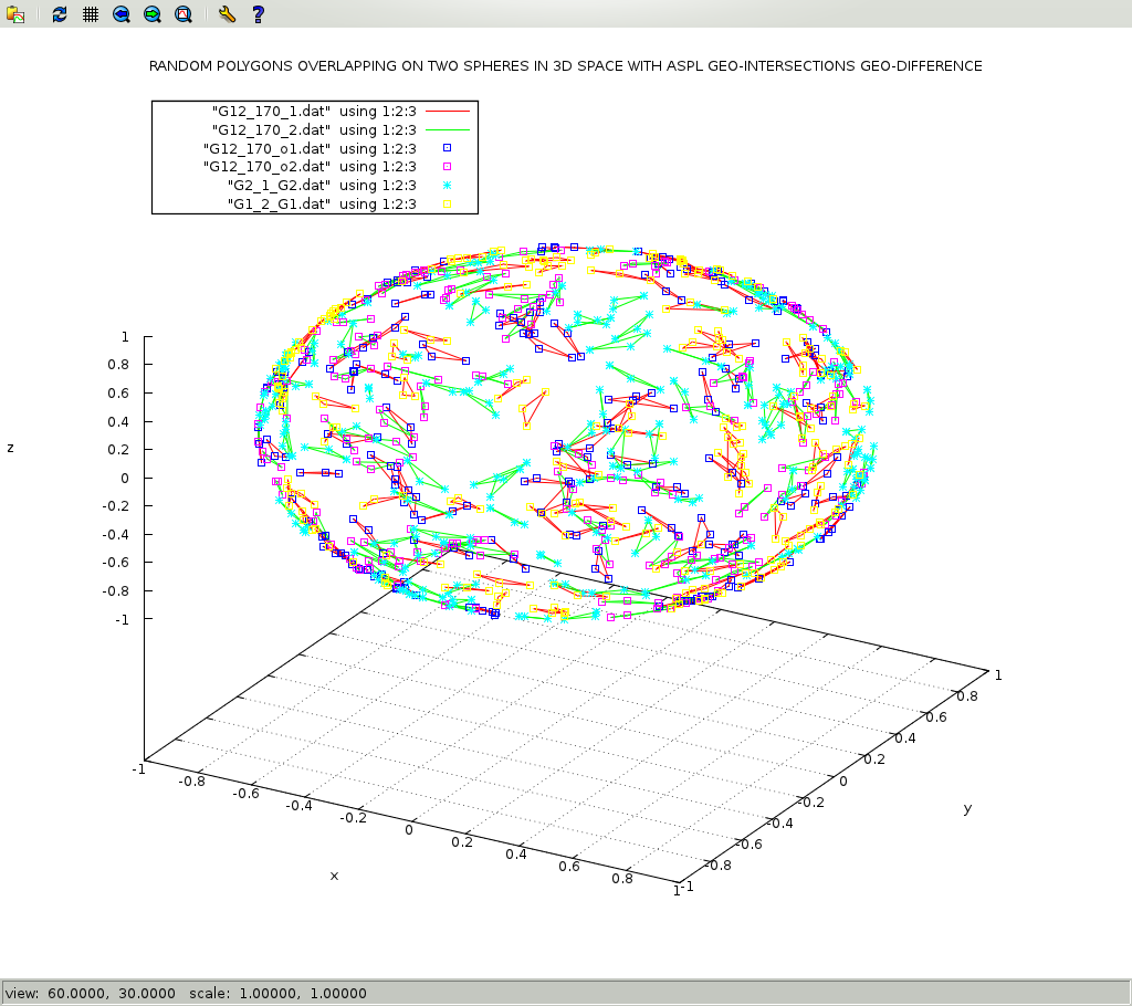 GEO Random Polygons on Two SpheresThe sample workspace POLY2CLOUDS shows how to use ASPL operators to do contextual set operations on geometric data. This workspace's element grouping class is GEOSPHERES, therefore ASPL switches the set operators f& and f\ to do contextual set intersection and set difference according to contextual routines, here they are the GEOmetric routines.