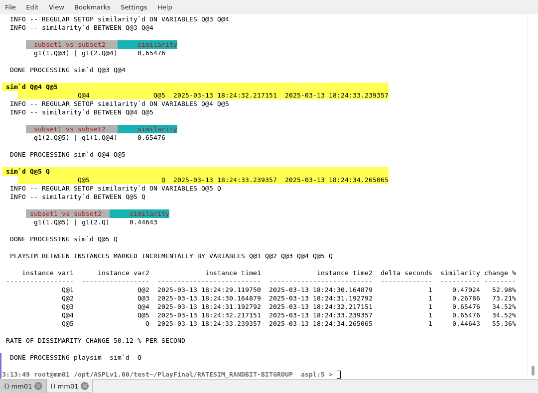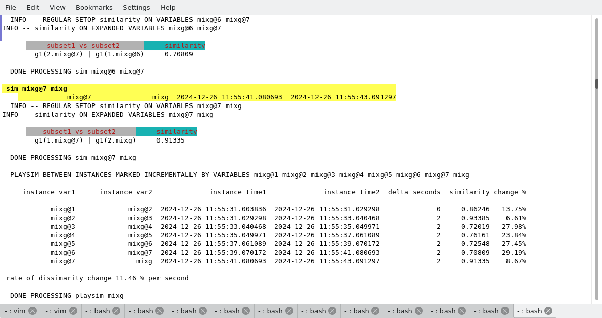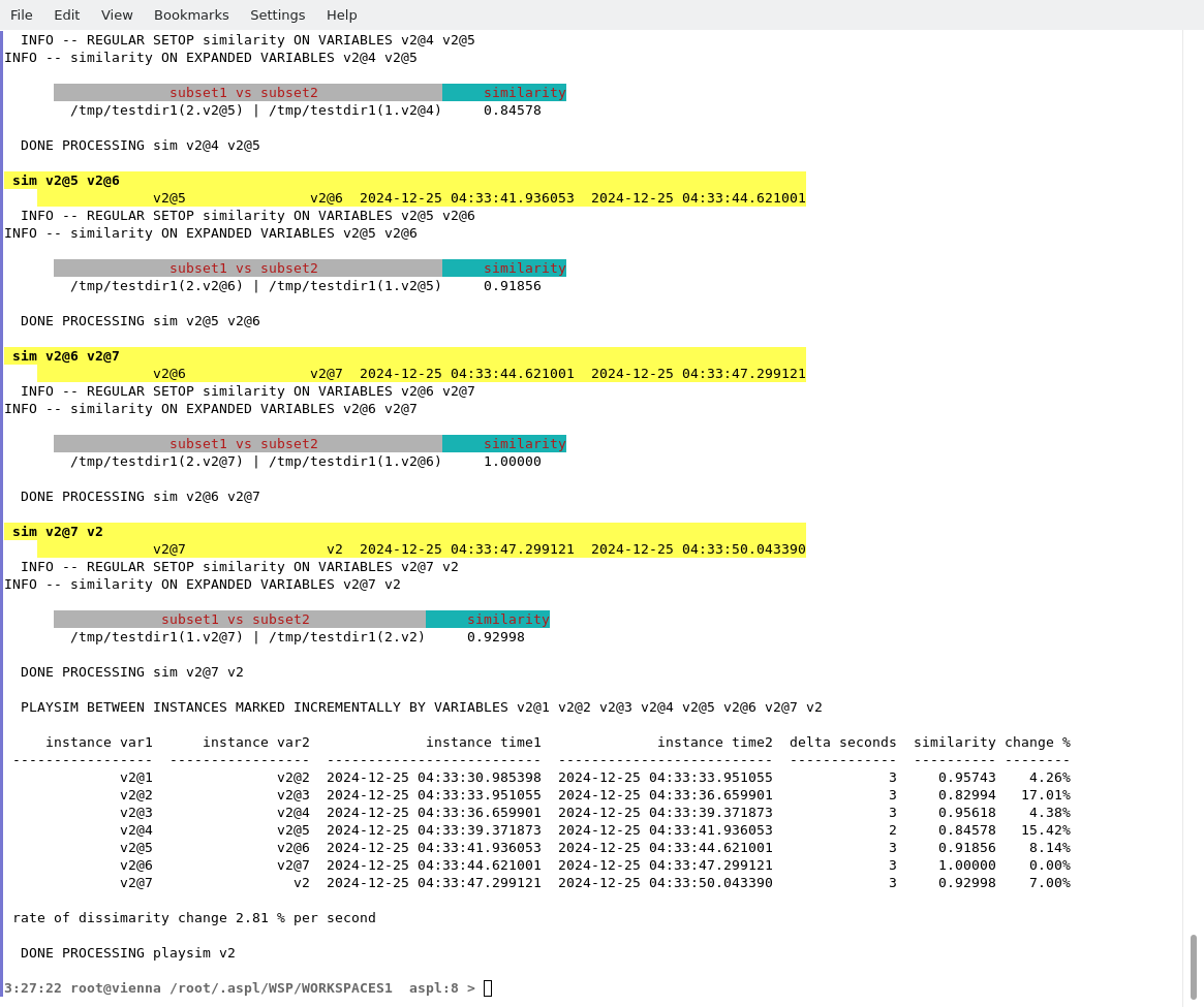 The command playsim displays the similarity between a set variable and all its archived historical. The rate of change in dissimilarity is shown once the command terminate execution.