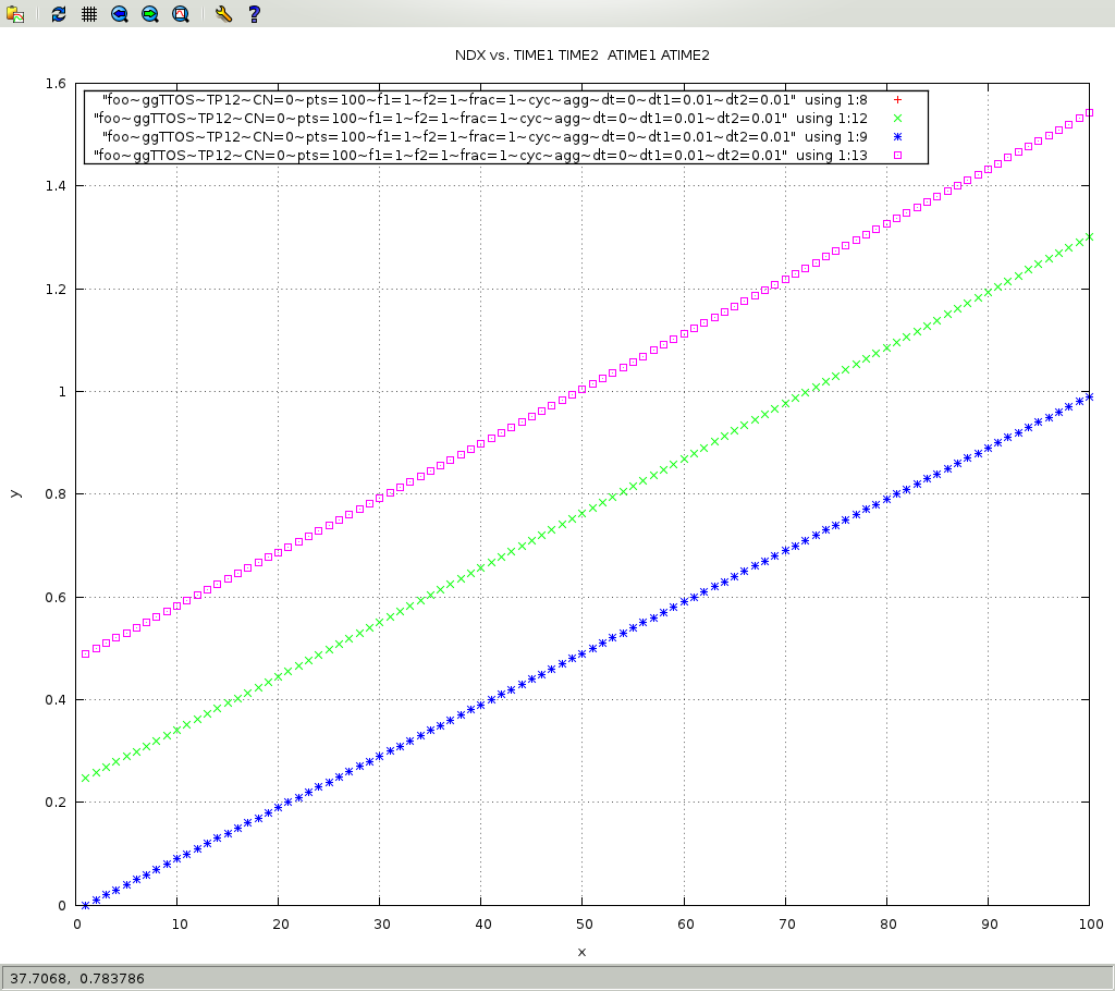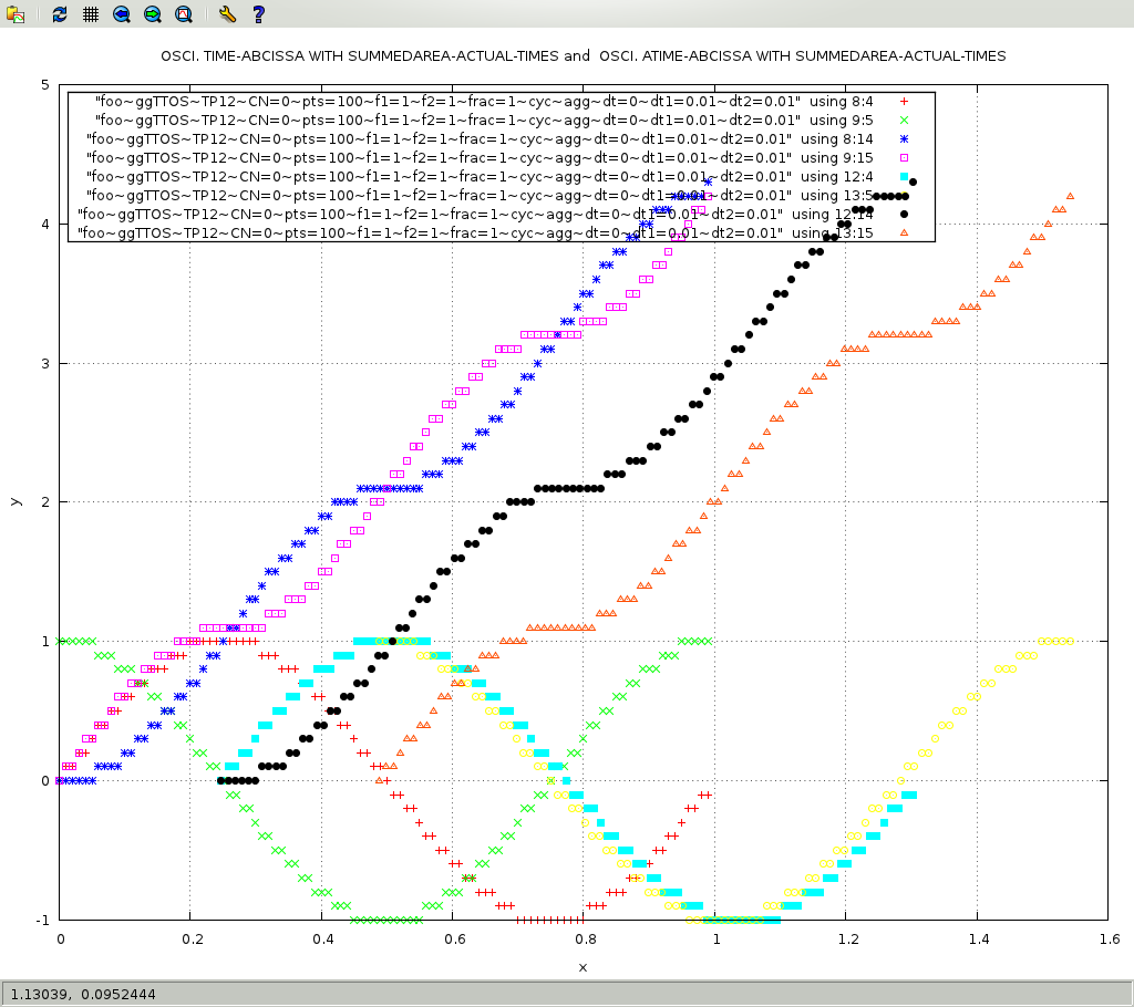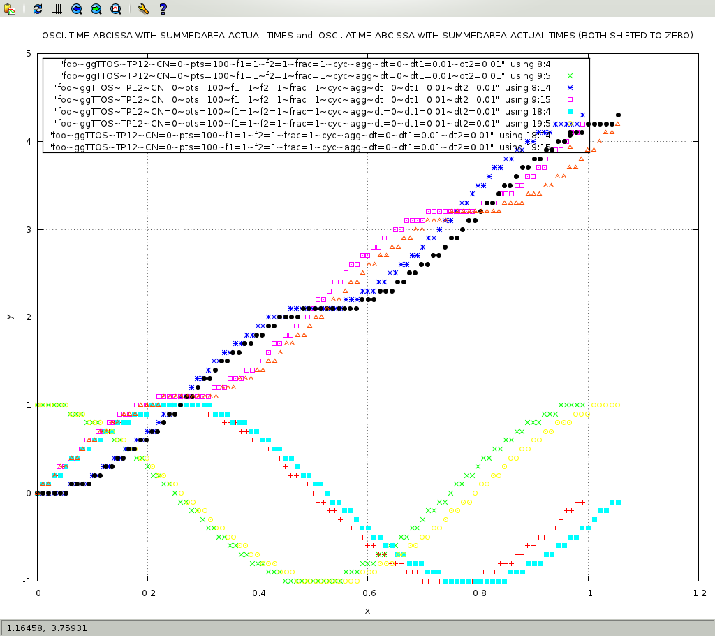 The following figure shows the index of the one hundred points on the X axis versus the time of the oscillating functions. TIME1 and TIME2 are for physical time and are shown in the red-plus and blue-asterik respectively: the mapping of 100 points vs. the 1 second total time, both lines are superimposed. ATIME1, actual time for the first oschillator, tooks approximately 1.3 second, and is shown in green-cross, ATIME2, actual time for the second oschillator, tooks approximately 1.5 second, and is shown in magenta-dotted-square.